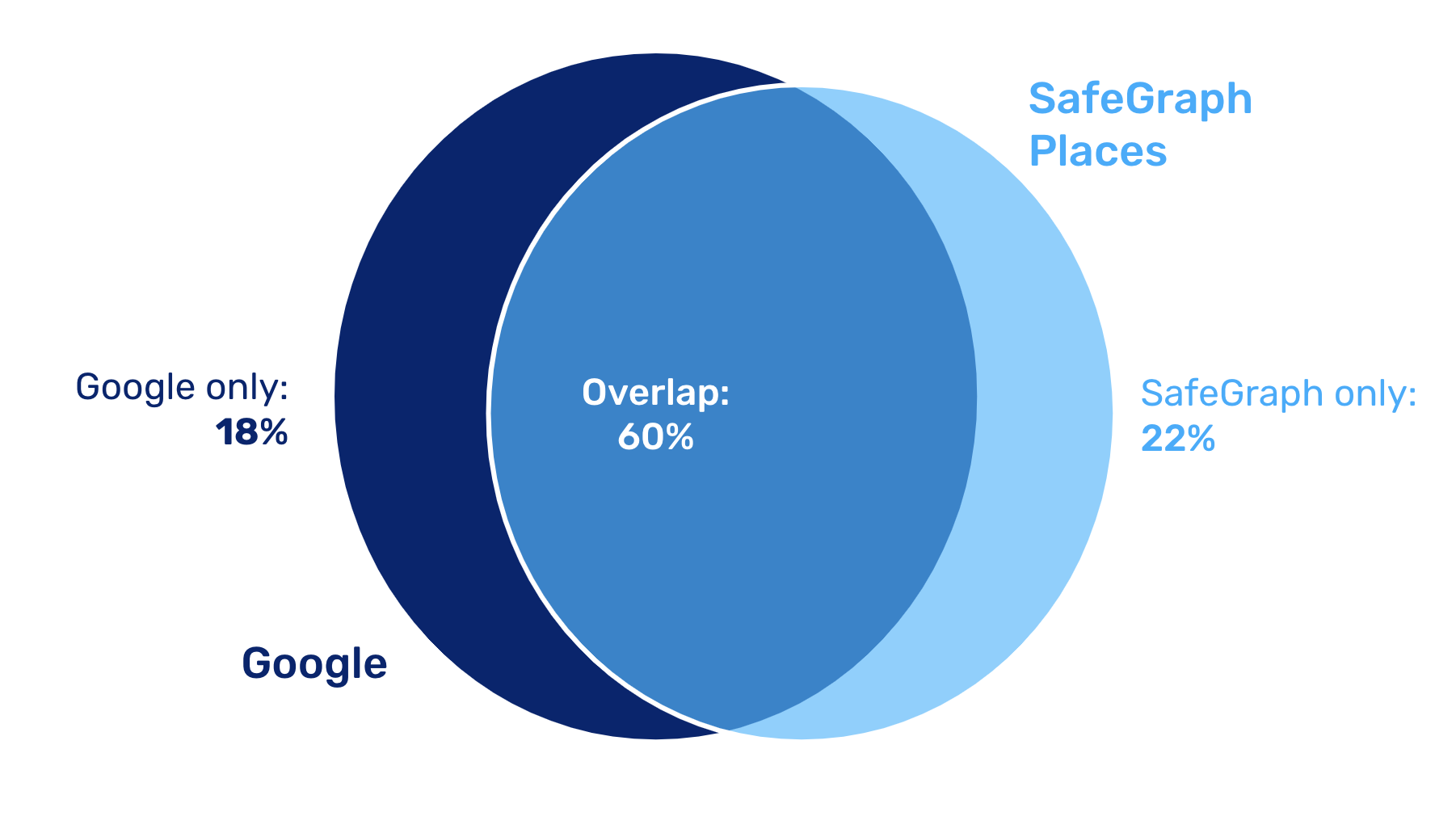 Using the sampled data, we've compared the total overlap of our data in the two zip codes with the same zip codes from Google, marking those that are unique to each dataset.